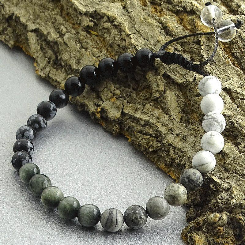 دستبند بافت سنگ عقیق سیاه،ابسیدیان،چشم عقاب،پیکاسوجاسپر،هولیت و کریستال کوارتز