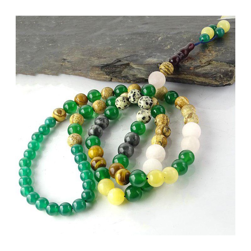 گردنبند سنگ عقیق سبز،جاسپرچوبی،چشم ببر،کلسیت،رزکوارتز،چشم عقاب و دالماتیان
