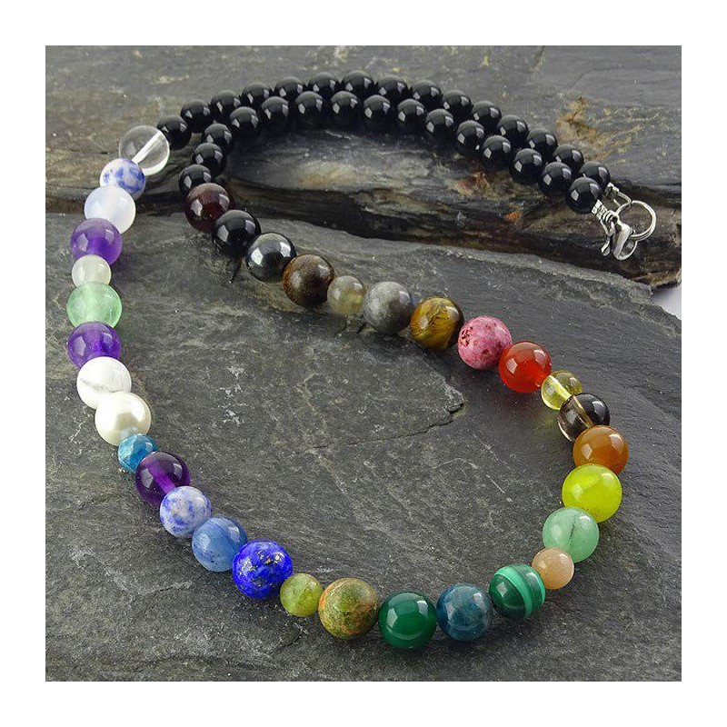 گردنبند عقیق سیاه و سنگ های ترکیبی،این سنگ به ایجاد یا تقویت شجاعت، نیروی درونی یا ابراز وجود صحیح شناخته شده است،به وضوح دید شخص کمک می کند که به دنبال آن عزت نفس وی تقویت میشود،کمک به رفع انسداد چاکراهای بدن،هدیه